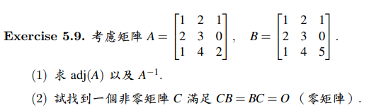 關於小題(2) Li 四, 2026-03-19 23:41 關於不是 full rank 的矩陣,可在左、右邊乘上非零矩陣得到零矩陣的問題,在上學期已討論過。為什麼在這個單元還會問這個問題呢?(1)(2)兩題有何關聯呢?當然是希望大家聯想到 $\mathrm{adj(A)}$ 的性質。至於 $\mathrm{adj(A)}$ 會不會是零矩陣?這是個有趣的問題。可參考 Exercise 5.11 的討論。 登入 或 註冊 以發表評論。