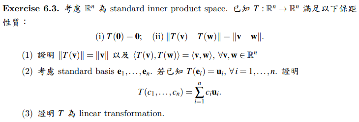 (a) 由 (i),(ii) 令 $\mathbf{w}=\mathbf{0}$ 便得 $\left\|T(\mathbf{v})\right\|=\left\|T(\mathbf{v})-T(\mathbf{0})\right\|=\left\|\mathbf{v}-\mathbf{0}\right\|=\left\|\mathbf{v}\right\|$