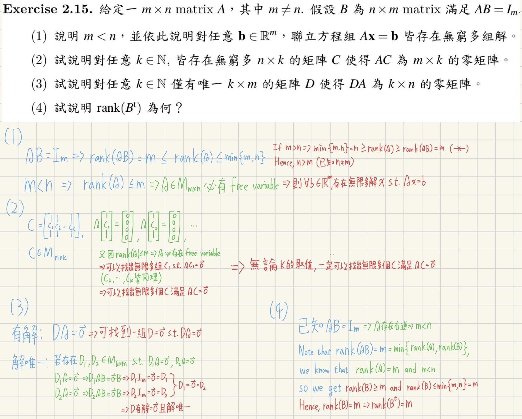 (1) 根據題意,給定$A\in M_{m\times n}$,其中$m\neq n$。假設$B\in M_{n\times m}$滿足$AB=I_m$,意即符合Thm 2.4.2 (4),其等價於(3)$rank(A)=m$。而一般而言,$rank(A)\le min\{m,n\}$,又題目假設$m\neq n$,故$rank(A)=m<n$,得出$m<n$。