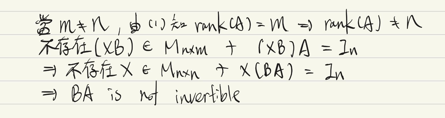 是...這樣嗎? 晴月夢 三, 2025-11-19 16:27 第 (2) 小題證明敘述By Contrapositive。若 \(BA\) 為 \(n\) 階可逆方陣,由 (1) 得 \(rank(B) = rank(A) = n\),又由條件和 (1) 得 \(rank(A) = rank(B) = m\),故得 \(m=n\)。 在 (2) 時我們有 \(BA \in M_{n\times n}\)、\(B \in M_{n\times m}\)、\(A\in M_{m\times n}\),加上 \(BA\) 為 invertible 的假設,其實就滿足套用 (1) 的前提。不確定是否足夠達意。 登入 或 註冊 以發表評論。