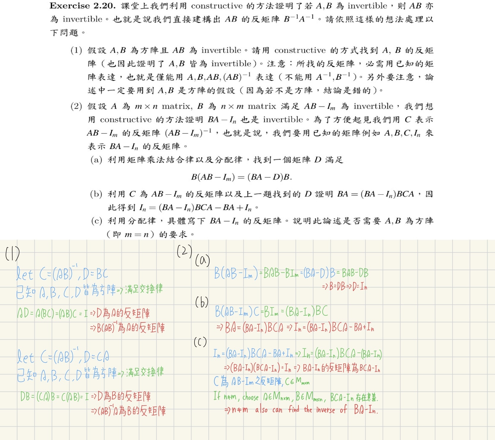 對於包子的解答,我稍微以自己的方式排版了一下,我覺得包子的(c)解答不夠嚴謹(有怪無錯),要說明矩陣A、B是否為方陣,需要驗證所有矩陣乘法的階數是否符合(不知道要不要把所有矩陣的階數寫出來?),以及所求反矩陣的矩陣是否為方陣,因為若不為方陣,則矩陣無反矩陣,以下為詳解: