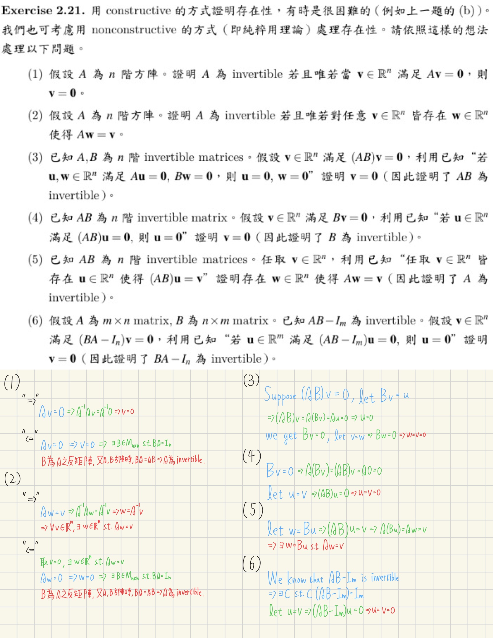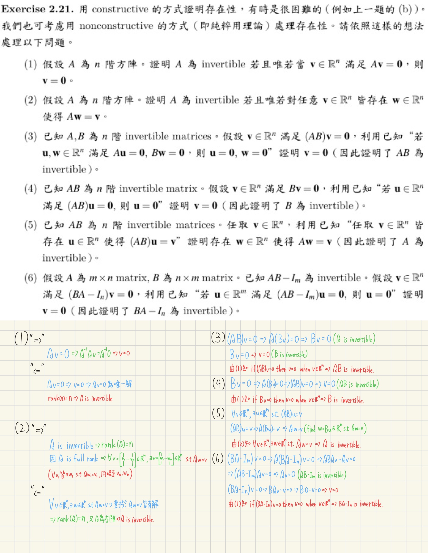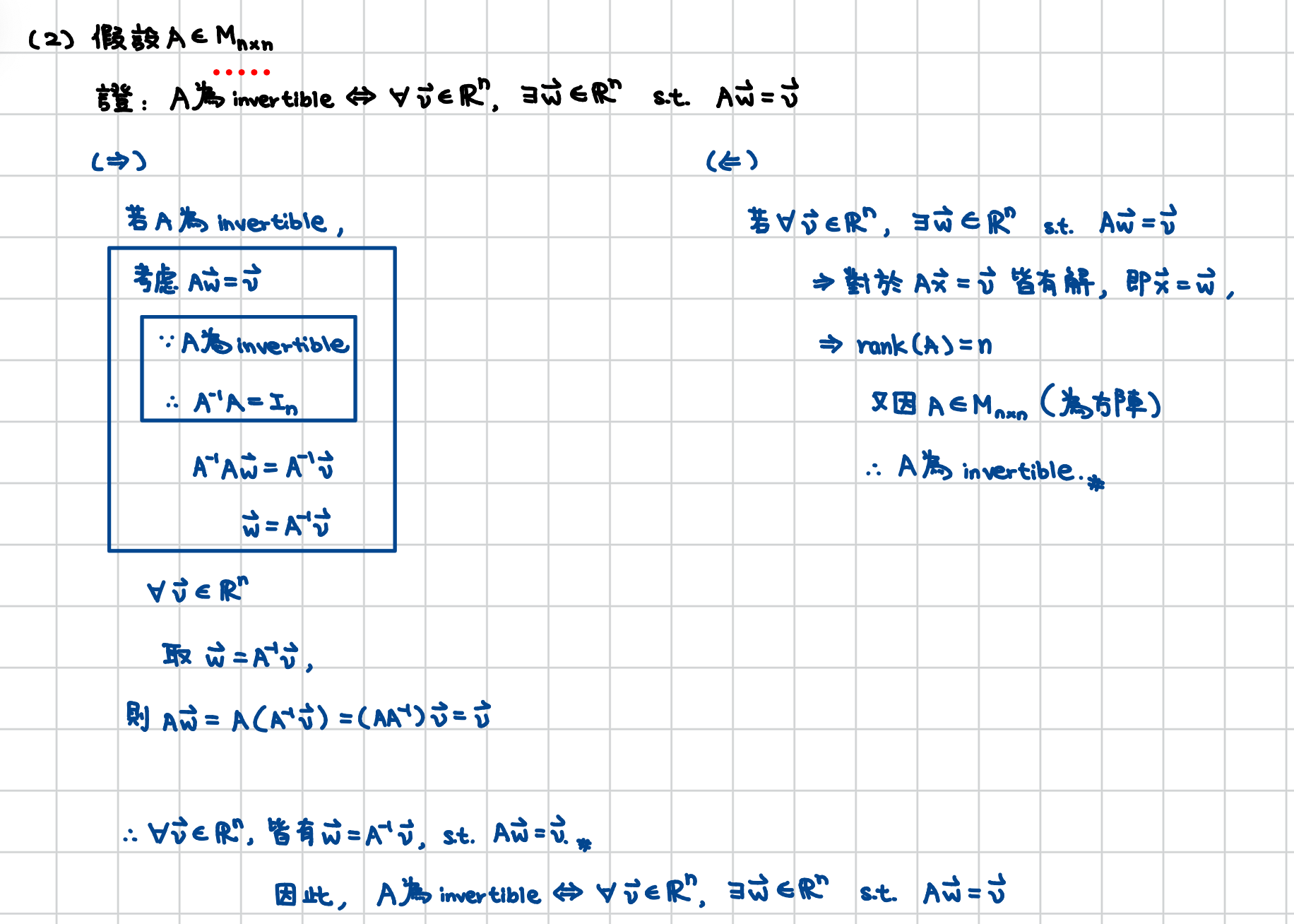 本題(1)(2)只是提醒(3)~(6)可以用這個方式說明矩陣的可逆性。只要清楚說明用到講義或課堂上所提及可逆的等價條件即可。例如 jcw 所提: 『若 $A\mathbf{v}=\mathbf{0}$,則 $\mathbf{v}=\mathbf{0}$』,等價於 『$A\mathbf{x}=\mathbf{0}$ 有唯一解』,就OK!而 包子入侵 (2) 的論述問題很大:$\Rightarrow$ 寫的是唯一性,不是存在性(拜託別再犯錯!)。再次說明寫法應是以給定任意 $\mathbf{v}\in\mathbb{R}^n$ 開始,接著說找到的 $\mathbf{w}$ 是什麼(當然應和 $\mathbf{v}$ 有關),然後驗證成立。而 $\Rightarrow$ 的論述更是嚴重的邏輯錯誤,請務必更正。