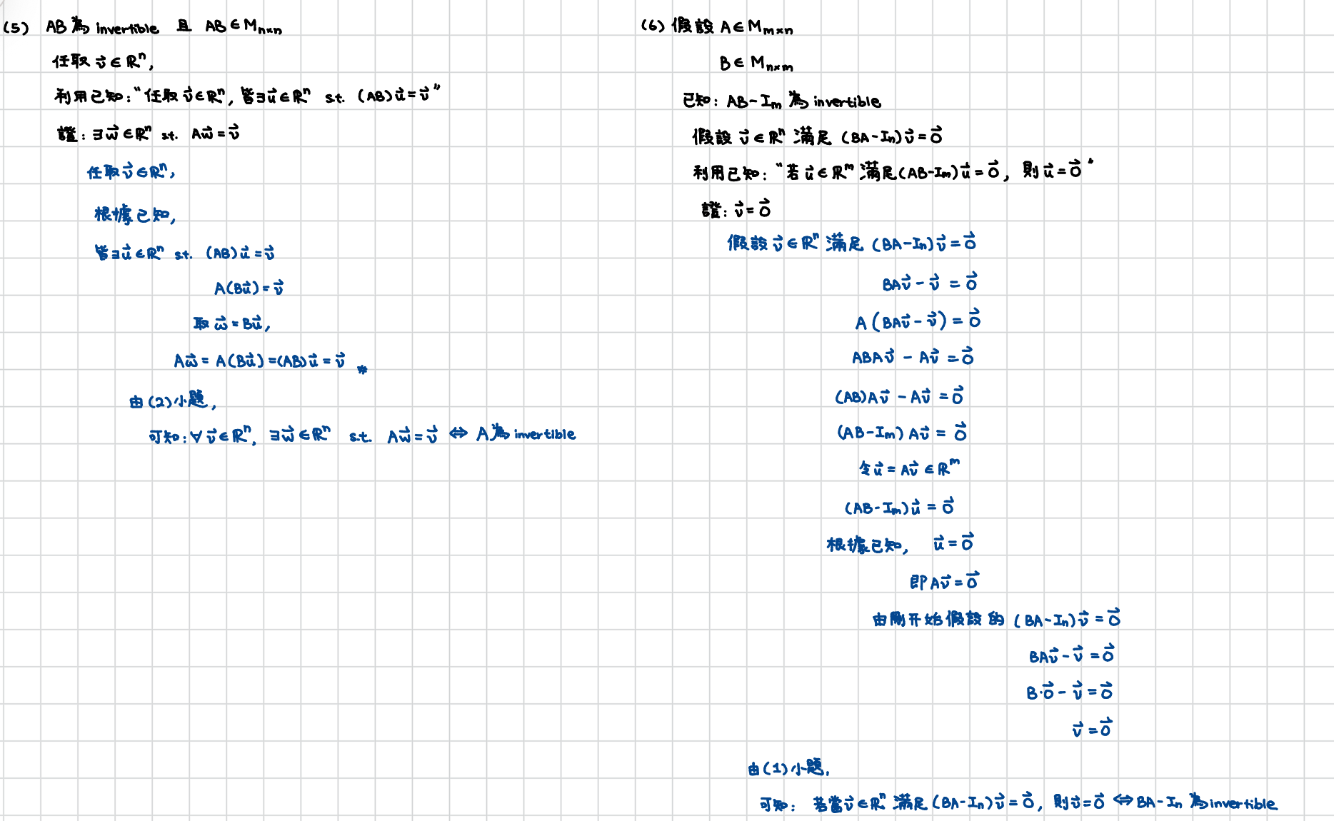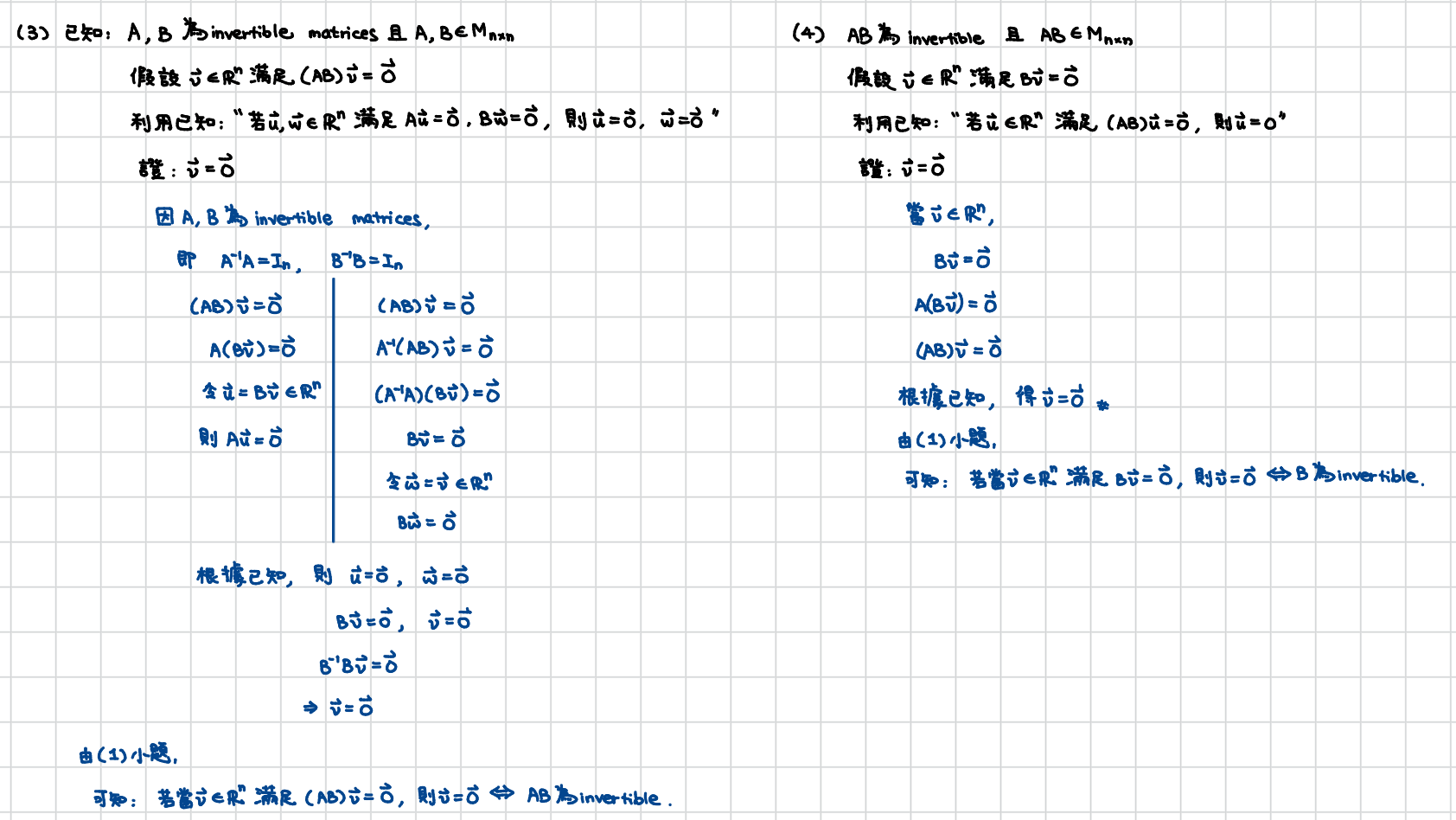 (3)~(6)題目所述"利用已知..."只是提醒利用(1)或(2)來說明可逆性。例如(3)應從 $(AB)\mathbf{v}=\mathbf{0}$ 出發,說明如何利用 $A$ 可逆以及 (1) 可推得 $B\mathbf{v}=\mathbf{0}$。同理再利用 $B$ 可逆推出 $\mathbf{v}=\mathbf{0}$,也因此再由(1)得 $AB$ 可逆。請 包子入侵 依此方式再把(3)~(5)寫好,才可得到應得的點數。