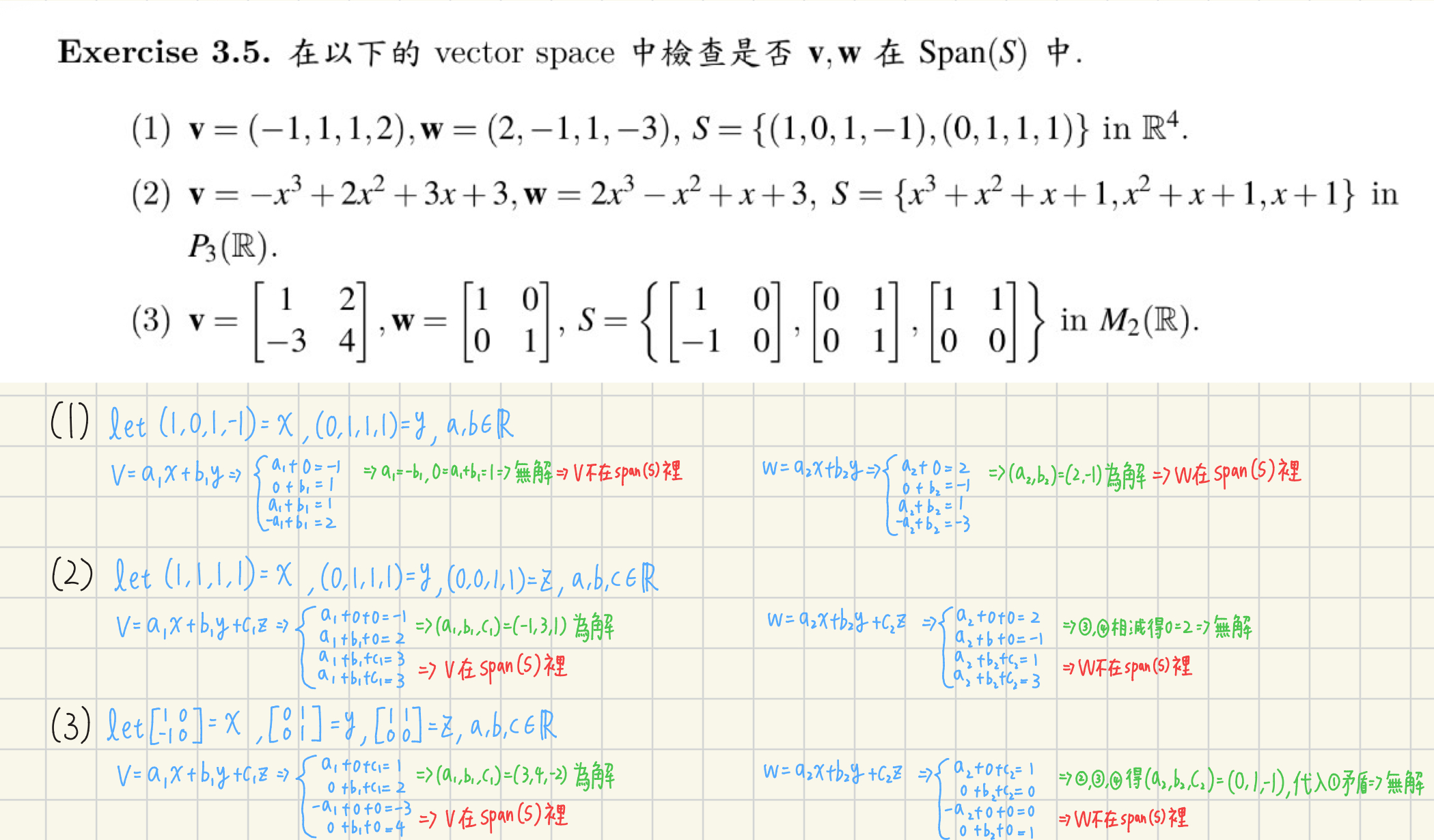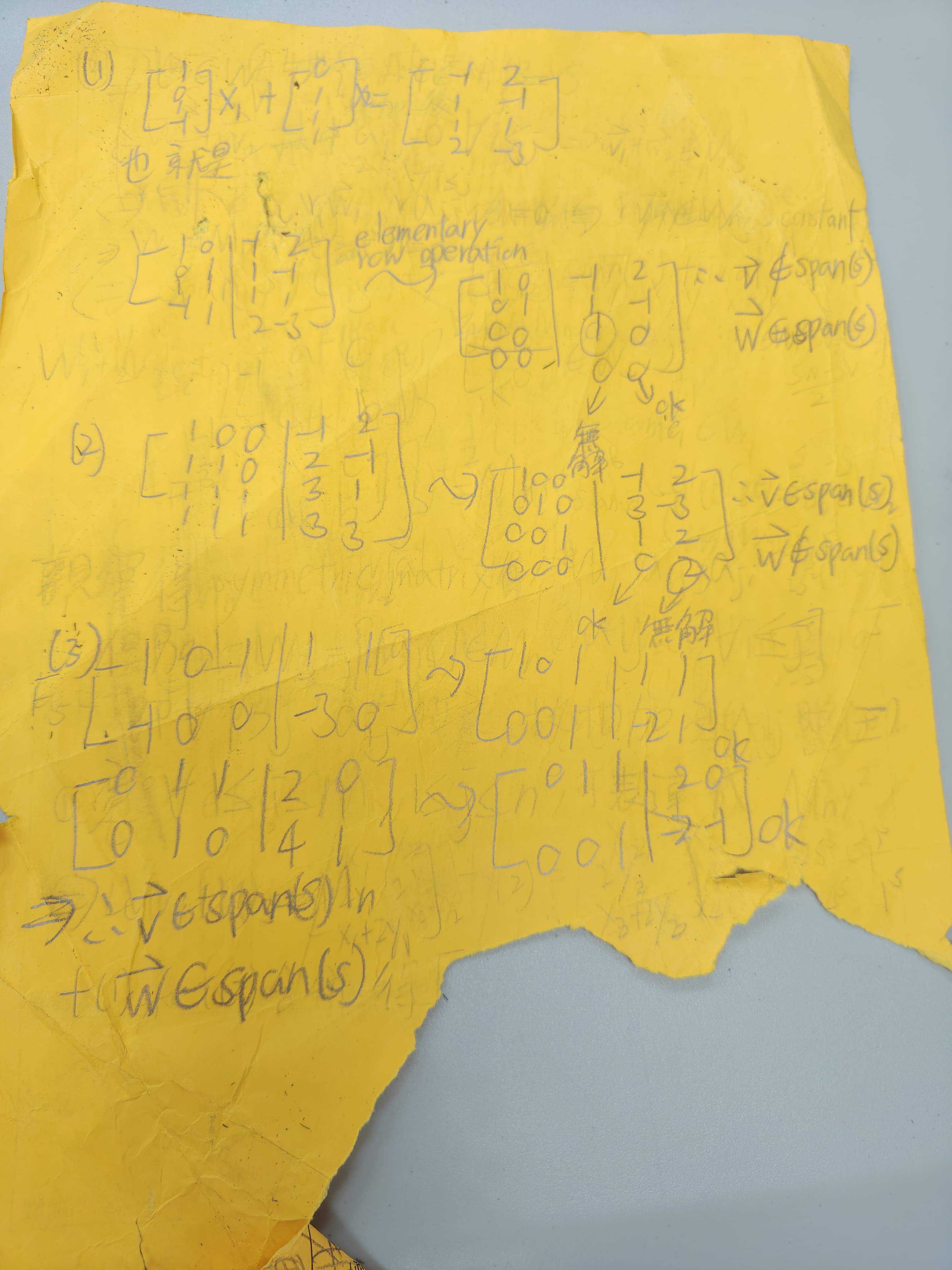 本題數據不複雜,主要評量理解 Span 的概念就是聯立方程解的存在性(請參閱考古題2)。希望同學列式時,理解方程組係數矩陣與 Span 裡的向量有何關係。希望大家能學習到課堂上(或前一次期中考)constraint equation 的概念。也就是當處理多組有同樣係數矩陣的方程組,可以先找到 constraint equation 再將要檢查的向量代入 equation 是否符合。張翔誠實名討論 將增廣矩陣再增廣,兩個方程組一起討論也是很棒的想法(上課提過,不過太多組的話還是 constraint equation 較實用)。但是最大的缺點是除了(1)以外;(2)(3)完全不知方程組怎麼來的(所以自己怎麼錯的也無法得知)。考試時,請不要如此否則無法得分。