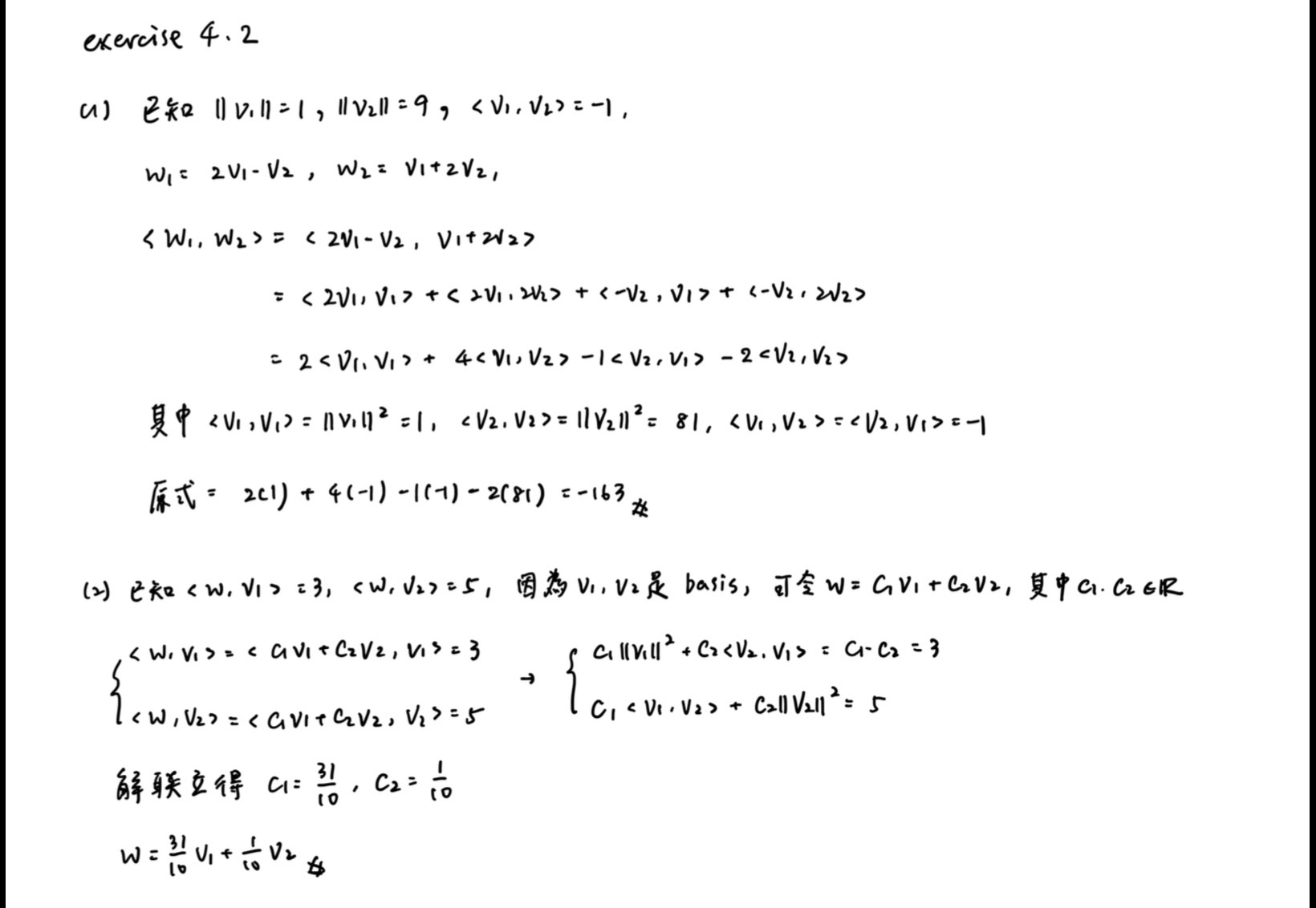 本題結案 Li 週五, 2025-12-12 18:38 本題並沒限制在哪個向量空間。基本上若知道一組 basis 之間的 inner product 就可以決定所有向量之間的內積。反之,若知道向量與 basis 之間的內積,就可以確認此向量(不過只有在 orthogonal basis 的情況才不需解聯立)。有趣的是,本題真的滿足 $\langle \mathbf{v},\mathbf{v}\rangle\ge 0$ 且只有在 $\mathbf{v}=\mathbf{0}$ 才會滿足 $\langle \mathbf{v},\mathbf{v}\rangle= 0$ 嗎? 登入 或 註冊 以發表評論。