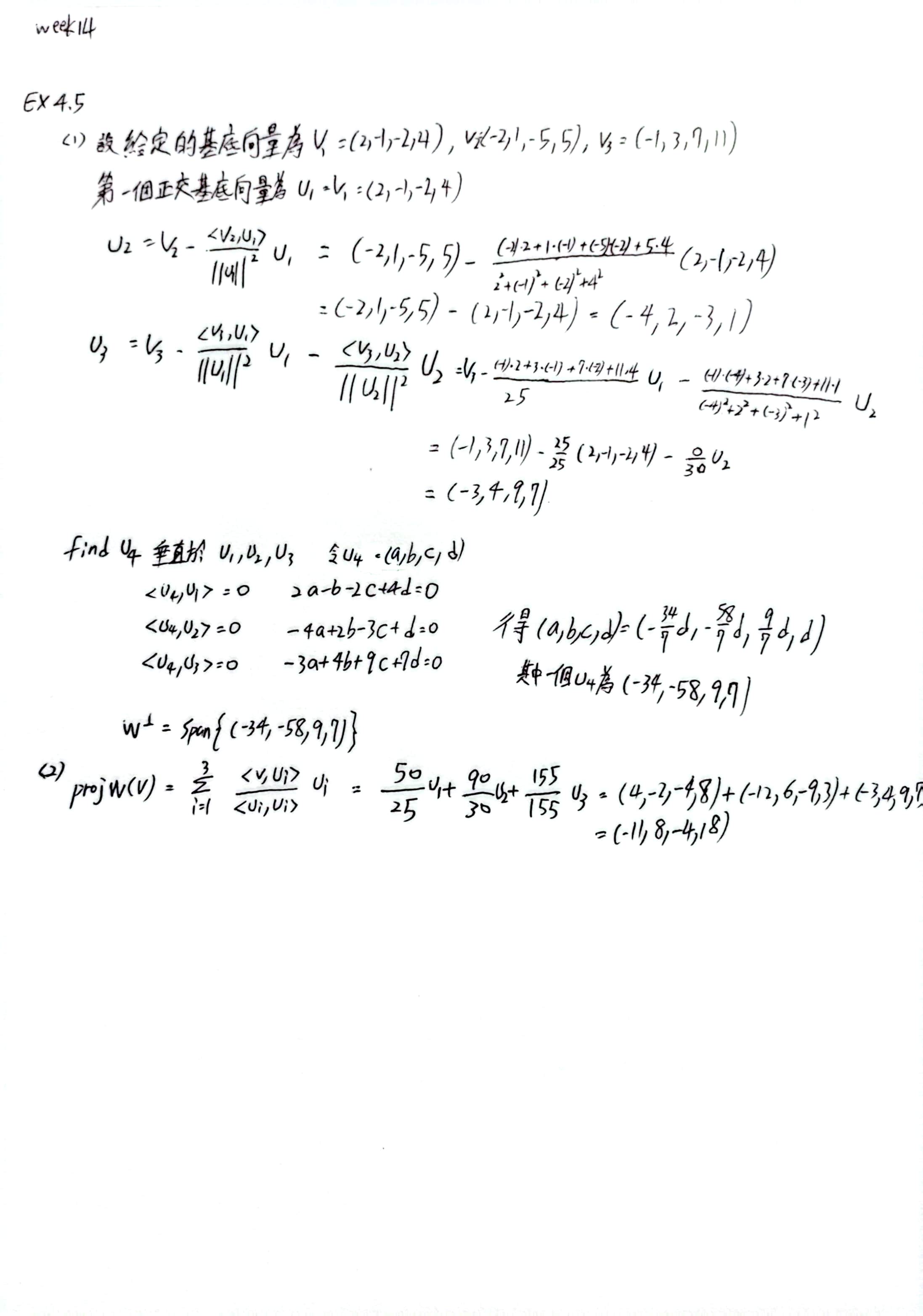 (1) $\mathbf{u}_4$… 林宥呈 三, 2025-12-10 02:28 (1) $\mathbf{u}_4$ 可以試著先找一個任意向量 $\mathbf{v}$ 滿足 $\mathbf{v}\notin W$,再使用 Gram-Schmidt Process 找出 $W^{\perp}$ 中的向量(2) 沒有求 $W^\perp$ 中的 orthogonal projection 登入 或 註冊 以發表評論。