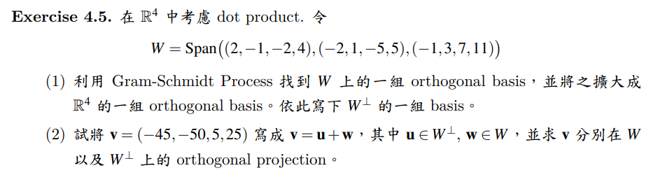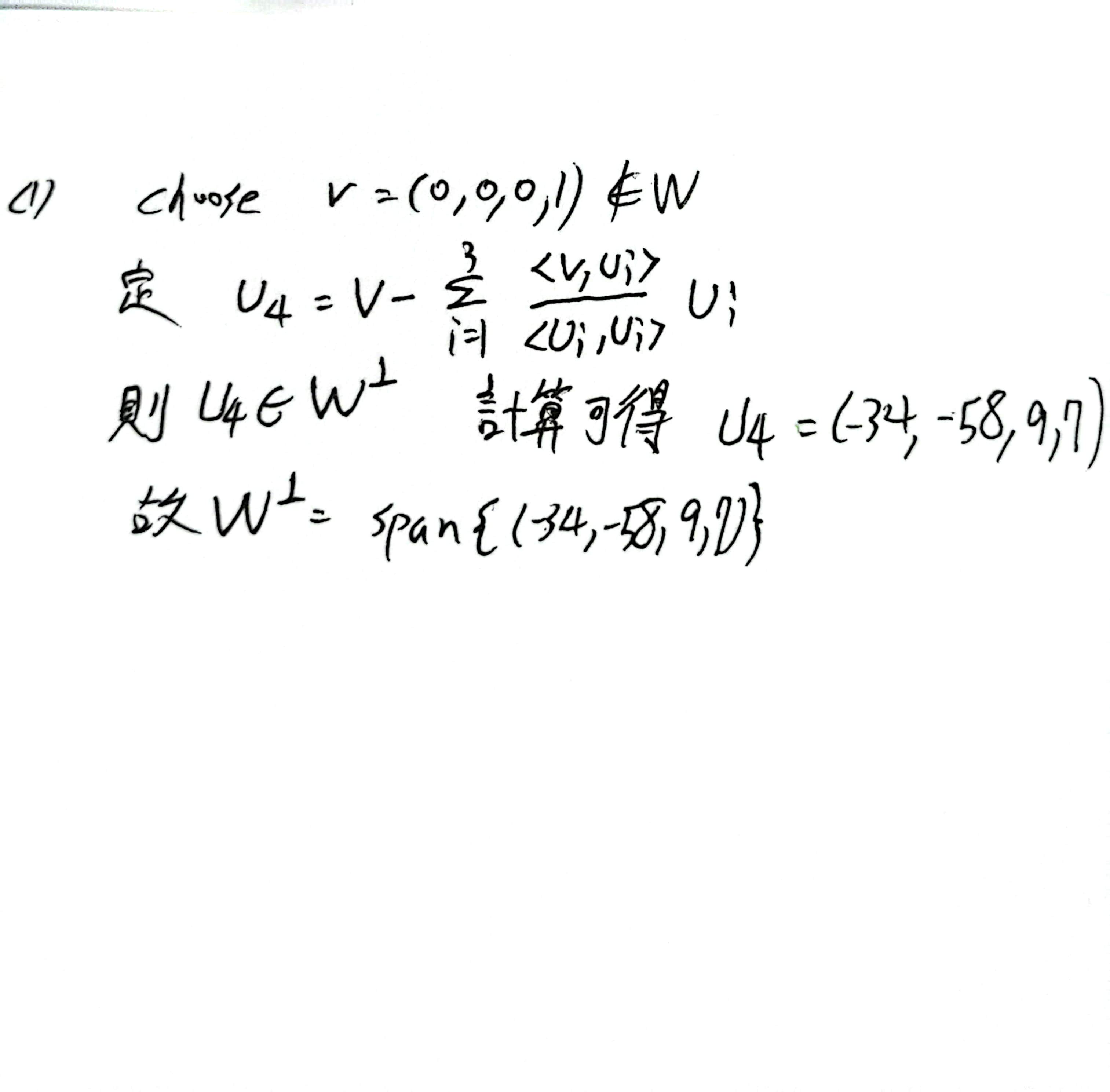 (1) $\mathbf{u}_4$ 可以試著先找一個任意向量 $\mathbf{v}$ 滿足 $\mathbf{v}\notin W$,再使用 Gram-Schmidt Process 找出 $W^{\perp}$ 中的向量